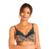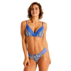 Soutien gorge coques souples. Microfibre imprimée au motif « fleurs ethniques » et bande de dentelle géométrique. Basque élastiquée sous poitrine. Bretelles fines et réglables. Fermeture 2 agrafes 3 positions. Disponible du 85A au 95D